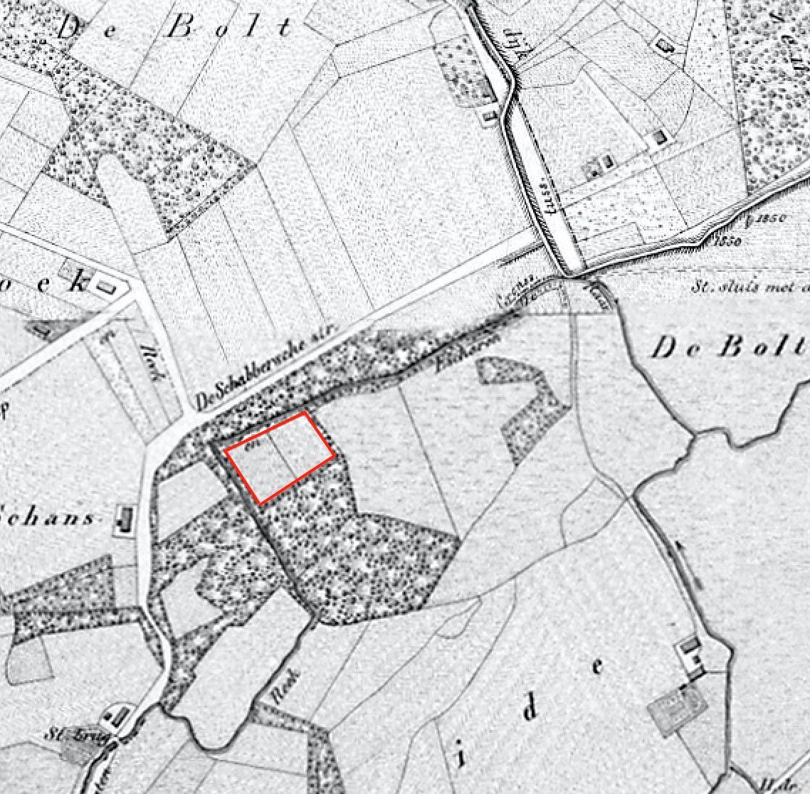 Op bovenstaande kadasterkaart van 1851 staat het perceel aangeven. Het was toen in eigendom van Peter van de Schans.