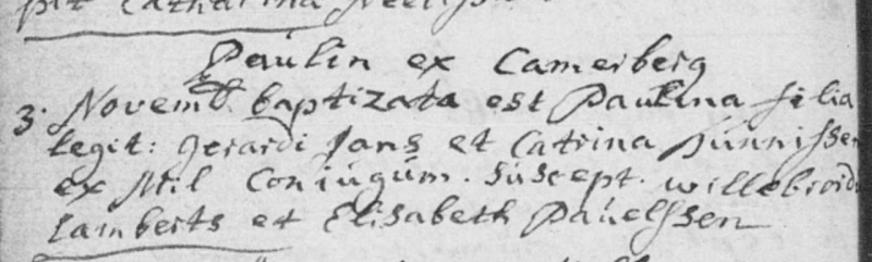 Hierboven een afdruk uit het doopboek van 'Parochia S. Lamberti': 3 nov. 1769, geboren te 'Camerberg', Paulina Jans.