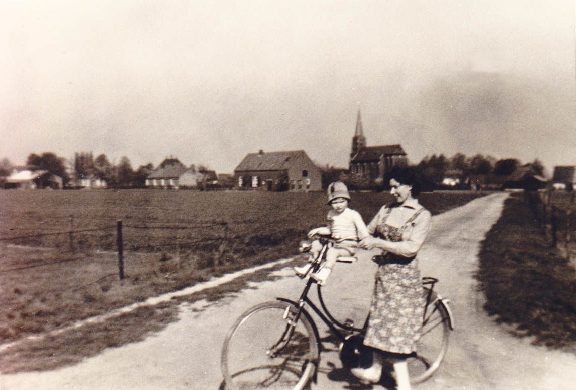 Gonny van Boekel-Roelofs met voorop de fiets, zoontje Jan. De Veldweg was toen nog een echte veldweg. De foto is genomen ter hoogte van de boerderij van Wim Bens.